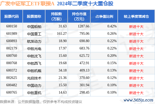 广发中证军工ETF联贯A为指数型-股票基金,字据最新一期基金季报清晰,该基金财富建立:股票占净值比4.6%,无债券类财富,现款占净值比5.54%。基金十大重仓股如下: