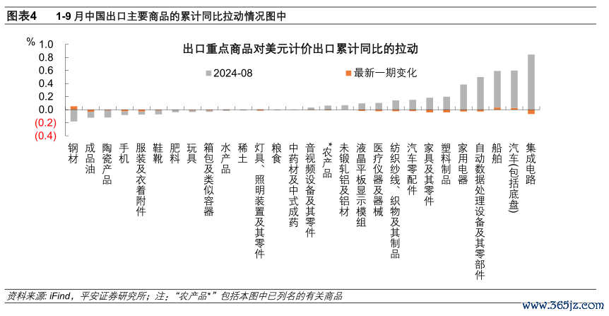 入口方面,9月中国入口的影响成分主要在于,一方面,原油和铁矿石入口的拉动显然下降,1~9月中国入口原油的数目累计同比为-2.8%,较上月降幅收窄;但入口铁矿砂过甚精矿的数目累计同比为4.9%,较上月有所回落。这标明铁矿石入口拉动下降受到价钱走弱与需求下降双重影响,与国内玄色产业链疲软相关,而原油入口主要受到价钱走弱成分株连。